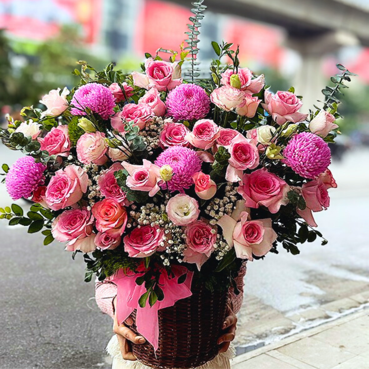 Hoa chính: Hoa hồng phấn, cúc mẫu đơn hồng tím, baby trắng, Hoa cẩm chướng hồng, Lá bạc (eucalyptus) và lá trang trí