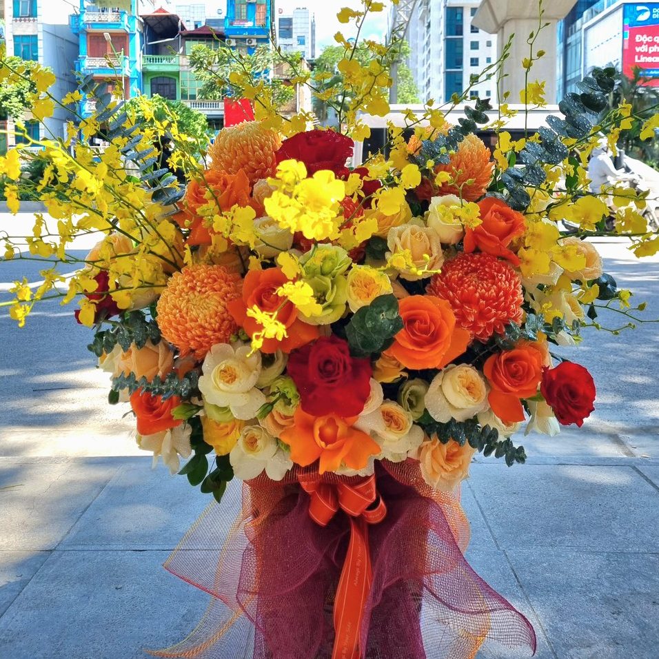 Hoa chính: Hoa hồng đỏ, cam, vàng, Cúc mẫu đơn vàng cam, Hoa lan vàng Oncidium, Hoa hồng kem, Lá bạc hà, lá phụ trang trí